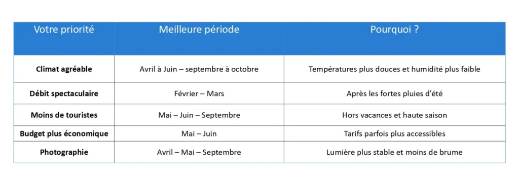 La meilleure période dépend de vos priorités. Pour un équilibre entre climat agréable, débit intéressant et affluence modérée, avril, mai, août et septembre sont souvent idéaux. Pour voir les chutes dans toute leur puissance, les mois après de fortes pluies offrent un spectacle impressionnant.
